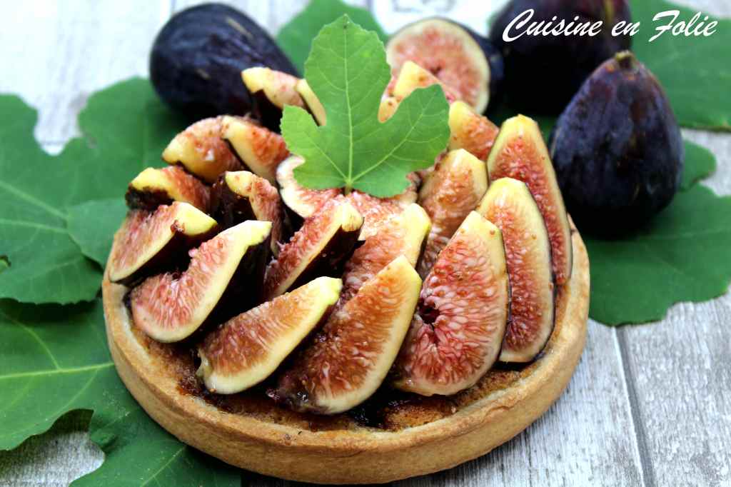 Une pâte sucrée, une crème d’amande garnie de figues cuites, une compotée de figues, et les figues fraîches en topping.