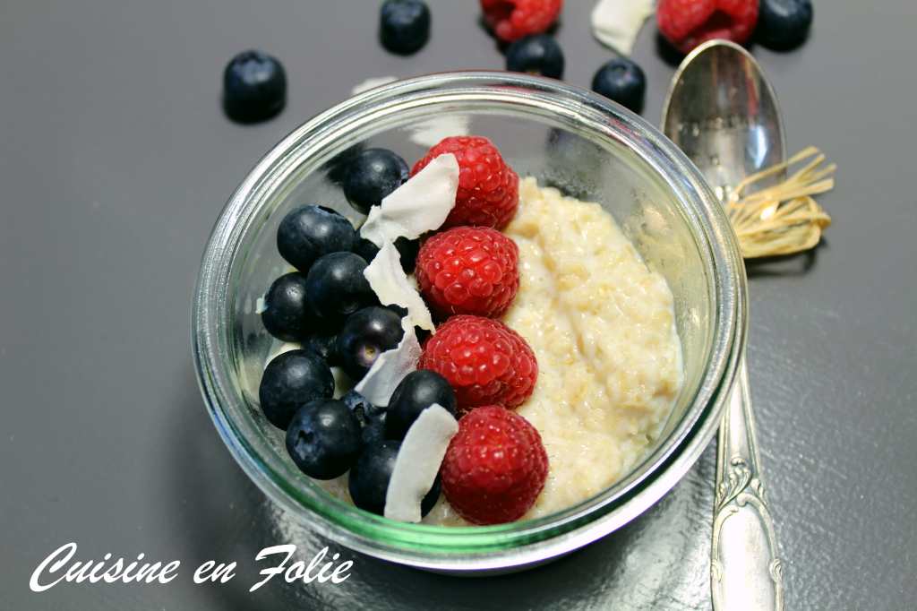 Healthy·Veggie·Weight Watchers·YouTube Porridge aux fruits rouges 21 septembre 202121 septembre 2021 Cuisine-en-folie Petit déj rapide, dessert gourmand ou collation plaisir, le porridge se savoure à toutes heures. Oui mais voilà, mon mari a eu la mauvaise idée de tester, et voilà qu’il adore ! Conclusion, recette double à chaque fois maintenant ! 😉 Je vous propose une recette à réaliser au micro-onde, je vous mettrai en ligne sous peu une recette identique à réaliser à la casserole. Cette fois j’ai choisi des fruits rouges, naturellement, à décliner avec les fruits de vos envies. Bonne dégustation !!! Ingrédients pour 1 personne : – 15 cl de lait animal ou végétal en fonction de vos goûts – 30 g de flocons d’avoine – 1 cc de sirop d’agave, de miel ou de sirop d’érable – fruits de votre choix Mettre tous les ingrédients dans un bol, remuer et cuire 2 min 30 au micro-onde. Remuer et décorer avec des fruits rouges (framboises, blueberries et copeaux de noix de coco sèche pour ma part). Partager : Cliquer pour partager sur X(ouvre dans une nouvelle fenêtre) X Cliquez pour partager sur Facebook(ouvre dans une nouvelle fenêtre) Facebook J’aime chargement… Partager : Cliquer pour partager sur X(ouvre dans une nouvelle fenêtre) X Cliquez pour partager sur Facebook(ouvre dans une nouvelle fenêtre) Facebook J’aime chargement…