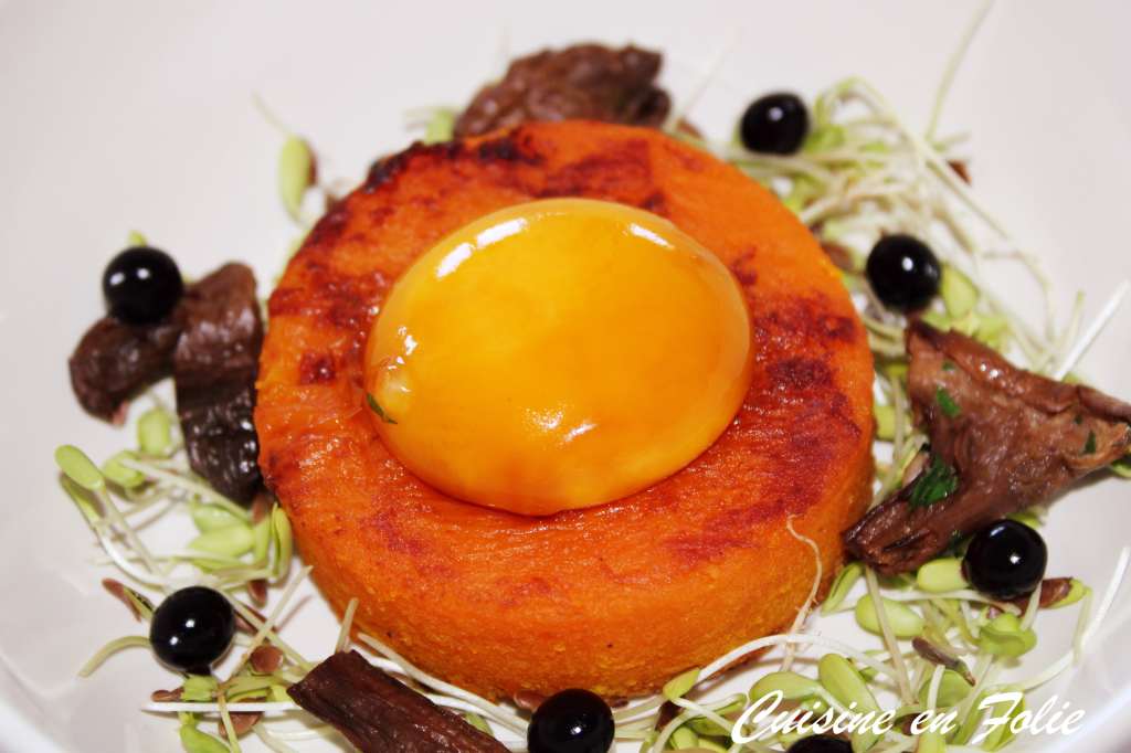 Déposer au centre le disque de potimarron et le couvrir avec le jaune d’oeuf qu’on aura retiré du soja.