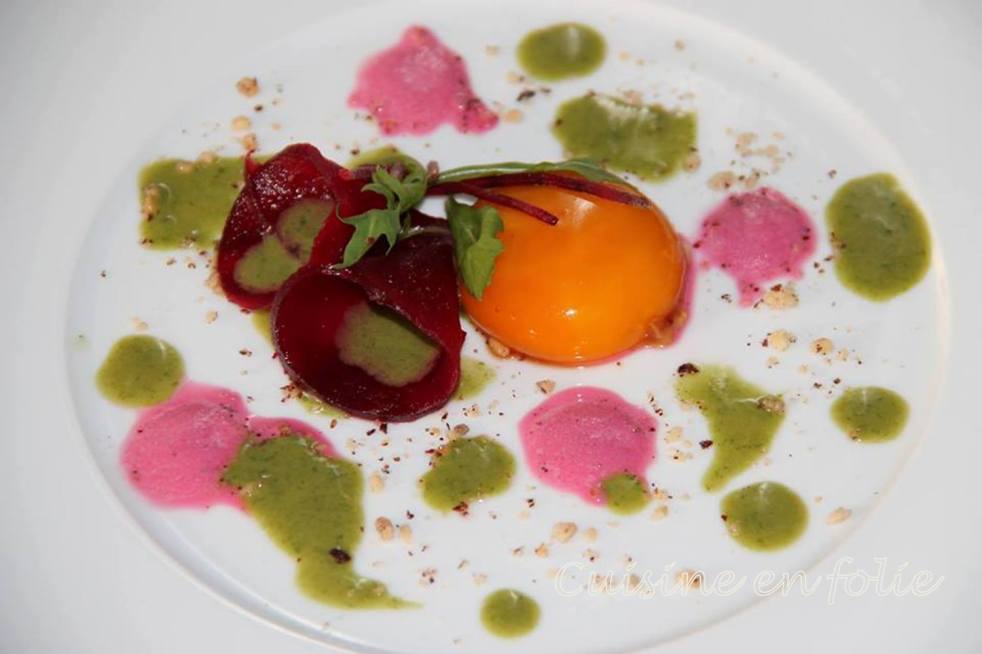 L’oeuf mariné au soja, coulis mâche, roquette et betterave