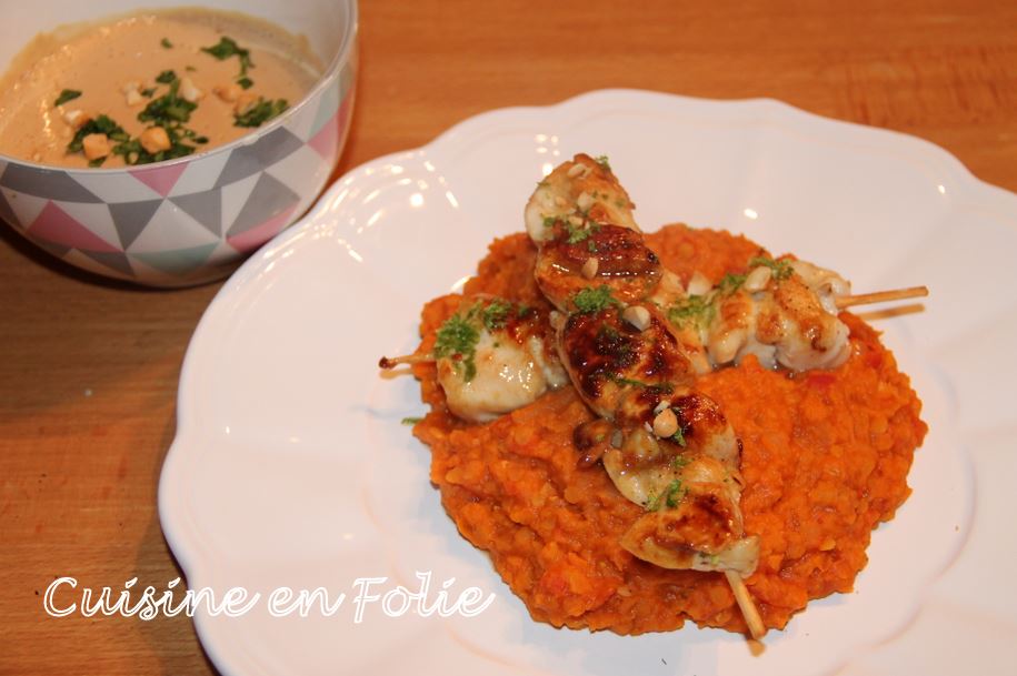 Brochette de poulet au citron, sauce cacahuète, dahl de lentilles corail au lait de coco
