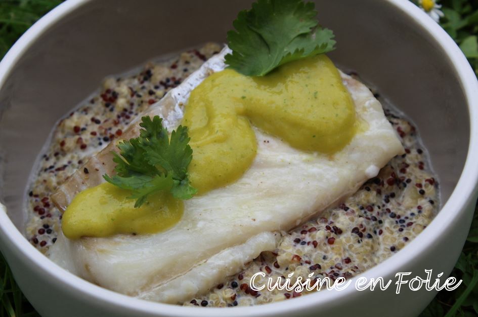 Dos de cabillaud et son pesto de mangue sur lit de quinotto au lait de coco