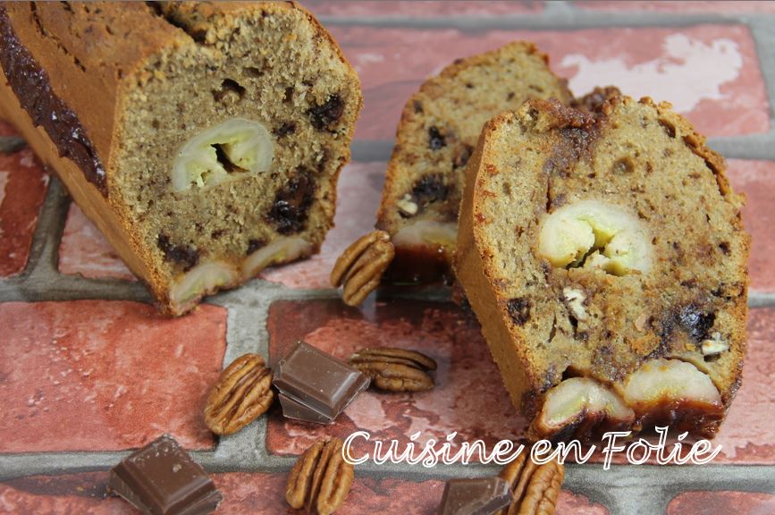 Cake banane, chocolat, noix de pécan et caramel au beurre salé